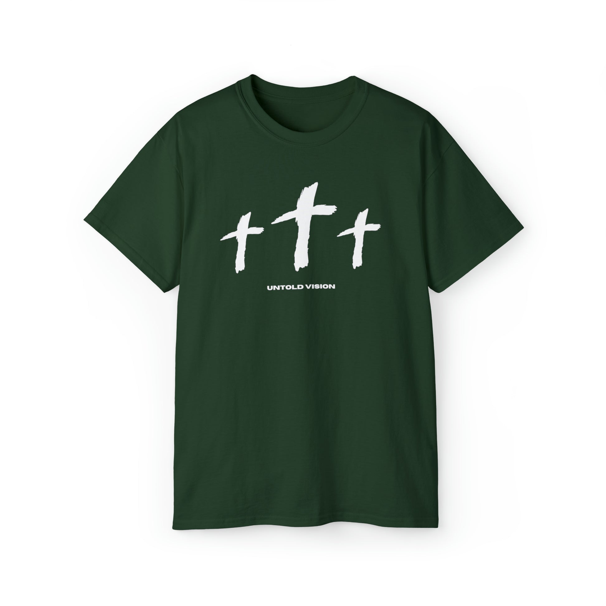 "Embrace timeless symbolism with our Three Crosses T-shirt. Each cross represents faith, hope, and love – a powerful reminder of values that endure through time. This tee blends classic design with profound meaning, making it a perfect addition to your wardrobe. Wear it with pride and let the three crosses inspire your journey."
